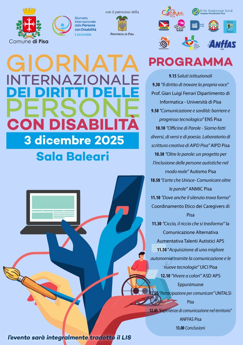 In occasione della Giornata Internazionale dei Diritti delle Persone con Disabilità, il Comune di Pisa organizza un incontro pubblico il 3 dicembre 2025, dalle 9.00 alle 13.00, presso la Sala Baleari di Palazzo Gambacorti.
