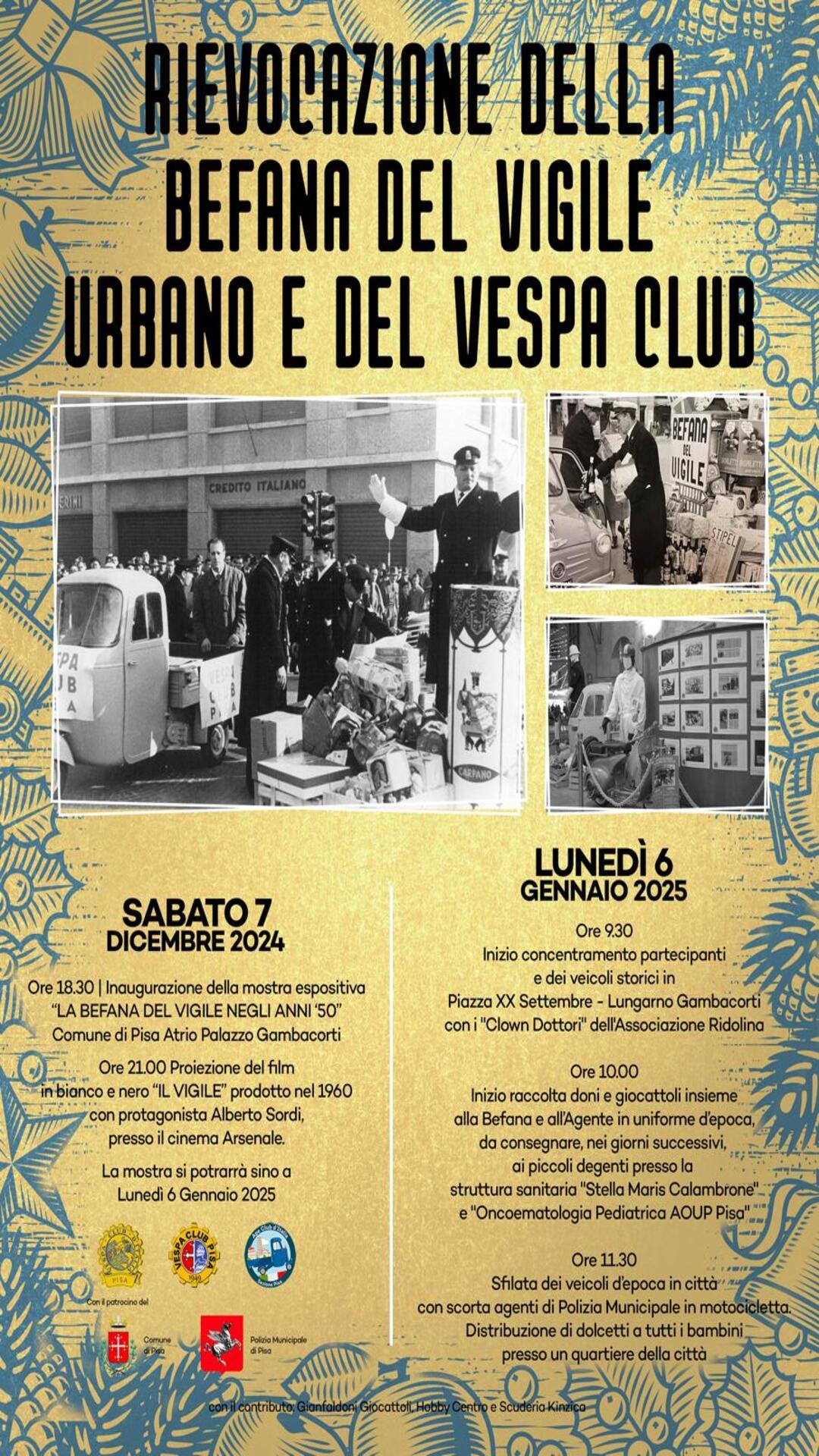 La “Rievocazione della Befana del Vigile Urbano e del Vespa Club” è una tradizione che risale agli anni ‘50 quando si diffuse l’usanza di recarsi presso le postazioni dei Vigili Urbani, collocate al centro degli incroci nei punti importanti delle città, per portare loro dei doni. Questa tradizione aveva un doppio significato: quello di riconoscenza per il lavoro svolto dai Vigili urbani in città e quello della solidarietà verso le persone meno abbienti. Nei giorni successivi, infatti, una parte dei doni ricevuti dalla popolazione veniva devoluta a scopo benefico dai Vigili urbani.