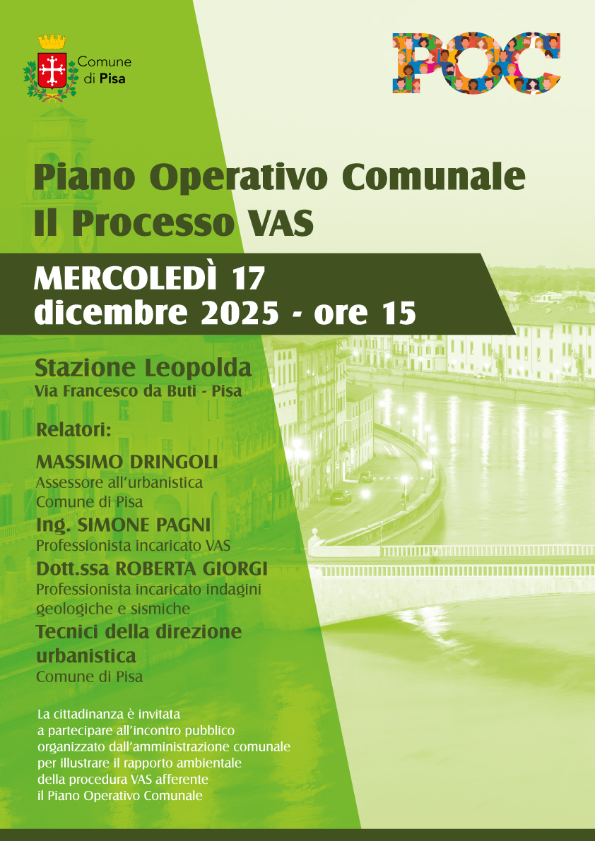 L’Amministrazione comunale di Pisa informa la cittadinanza che mercoledì 17 dicembre 2025, alle ore 15.00, alla Stazione Leopolda in via Francesco da Buti n. 1, si terrà un incontro pubblico dedicato al Piano Operativo Comunale e al processo di Valutazione Ambientale Strategica. L’iniziativa, promossa dal Comune di Pisa, ha l’obiettivo di illustrare il Rapporto Ambientale relativo alla procedura di VAS afferente il Piano Operativo Comunale, favorendo la conoscenza e la partecipazione informata dei cittadini. Nel corso dell’incontro interverranno l'assessore all'urbanistica del Comune di Pisa Massimo Dringoli, l’ingegner Simone Pagni, professionista incaricato della VAS, la dottoressa Roberta Giorgi, professionista incaricata delle indagini geologiche e sismiche, insieme ai tecnici della Direzione Urbanistica del Comune di Pisa, che approfondiranno i contenuti specifici e risponderanno alle osservazioni del pubblico. La partecipazione è aperta a tutta la cittadinanza interessata.