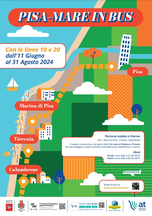 «A Pisa, grazie alla collaborazione con l’Amministrazione comunale - spiega Andrea Buonomini, direttore commerciale, marketing e tecnologie di Autolinee Toscane - puntiamo a valorizzare il trasporto pubblico come mezzo ideale per scoprire le bellezze di questo territorio. La campagna di comunicazione “Pisa-Mare in Bus” (at-bus.it/litoralepisano), che si affianca alla convenzione con il Comune per il biglietto unico Litorale Pisano, è stata ideata e realizzata per aiutare residenti e turisti a raggiungere la costa pisana in modo facile, etico e sostenibile, utilizzando l’autobus. Anche questa azione congiunta Comune-Autolinee Toscane fa parte di un mosaico più ampio che oltre ai collegamenti col Litorale attraverso le Linee 10 e 20 che da Pisa raggiungono Marina di Pisa, Tirrenia e Calambrone, prevede anche la Linea 26 per il Parco Regionale Migliarino, San Rossore, ma anche le Linee (1+, 25) per Piazza dei Miracoli e Murales "Tuttomondo" e le Linee (1+, 5, 25, 26) per Palazzo Blu. Un sistema di trasporto pubblico che consente a cittadini e visitatori di arrivare a pochi metri dalla destinazione turistica o culturale desiderata a bordo dei nostri bus».