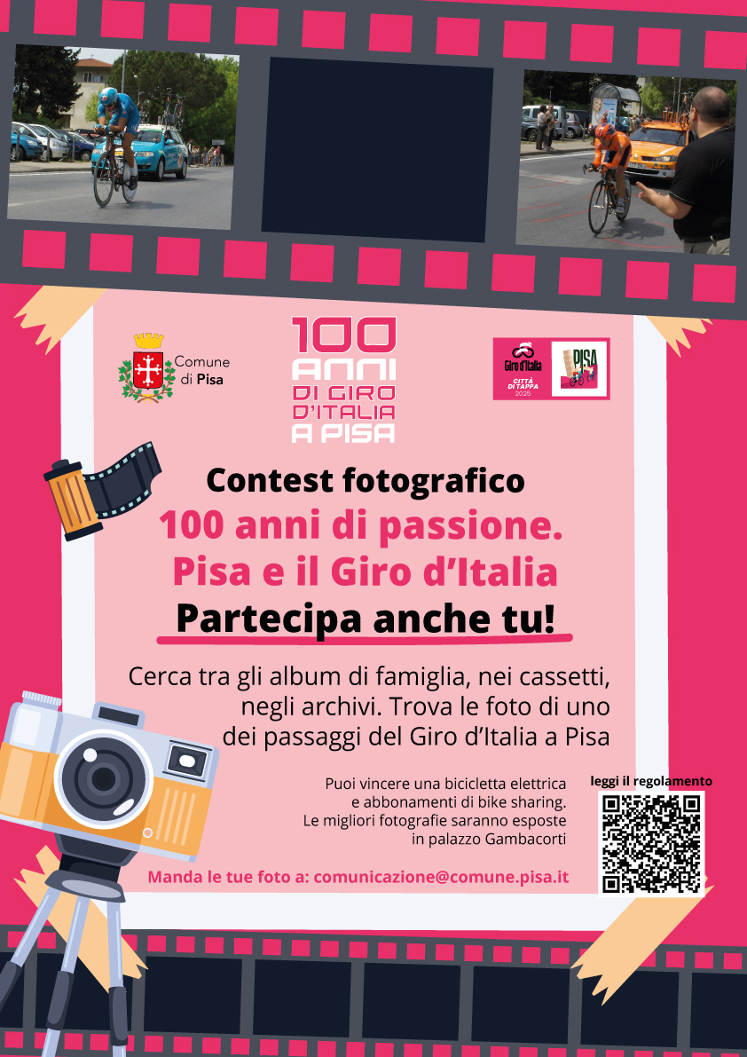 Il contest fotografico “100 anni di passione. Pisa e il Giro d’Italia” è promosso dal Comune di Pisa senza alcun scopo di lucro, allo scopo di promuovere l’appuntamento del 20 maggio 2025 quando Pisa sarà città di tappa della 108^ edizione del Giro d’Italia. L’ultima volta era accaduto nel 1980 e la prima volta che Pisa aveva ospitato il Giro era accaduto nel 1925, esattamente 100 anni fa.