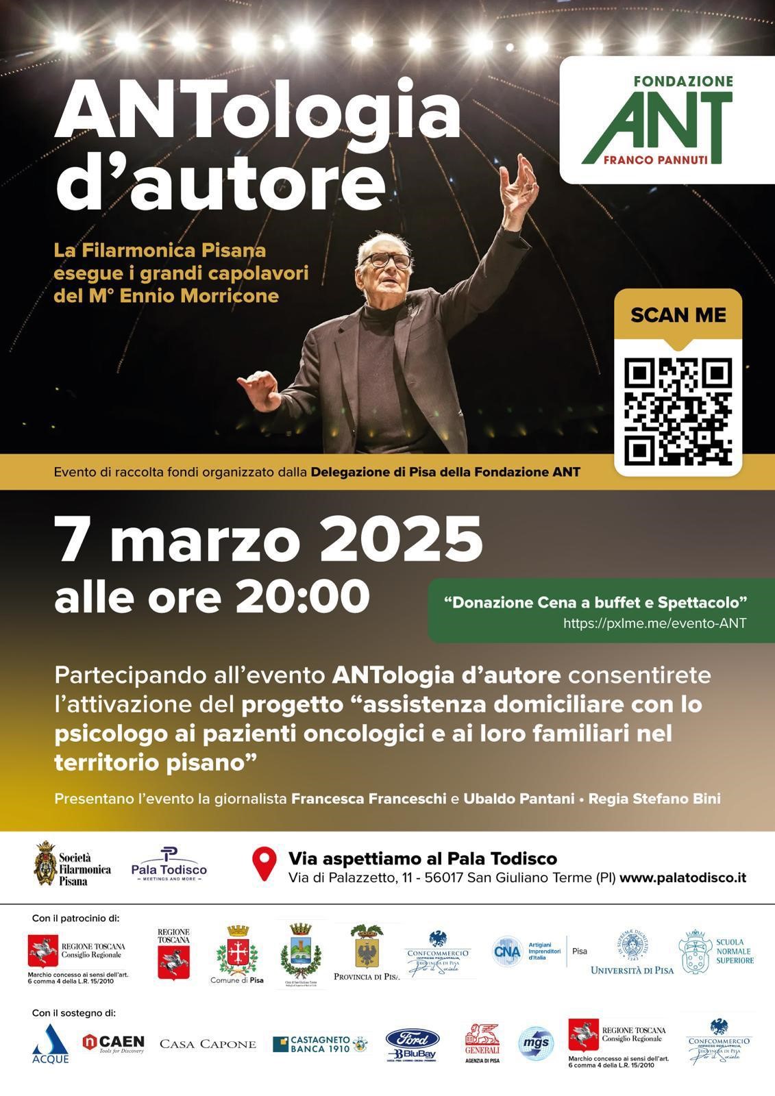 Il Presidente della Società Filarmonica Pisana, Antonio Brasile, dichiara, “siamo da sempre attenti ai temi sociali e a molti dei nostri concerti si affiancano raccolte fondi in favore di organizzazioni che operano nel campo della ricerca o nell'aiuto ai più deboli e bisognosi. Non potevamo quindi non raccogliere l'invito della Fondazione ANT e mettere nuovamente la nostra musica al servizio degli altri e del territorio Pisano. Il concerto di venerdì 7 marzo rappresenta un'antologia delle pagine più indimenticabili della produzione musicale del Maestro Ennio Morricone. Dalla Trilogia del Dollaro a capolavori come “Ave Maria Guarany” da "The Mission" per coro, temi da "C’era una volta il west", "Il clan dei Siciliani", "Il Segreto del Sahara" e "The Hateful Eight" solo per citarne alcuni. L'evento non sarebbe stato possibile senza il supporto dei docenti della nostra Scuola di Musica e del maestro Francesco Saviozzi, che hanno preparato l'orchestra d'archi, del maestro Giovanni del Vecchio che guida il coro "Enrico Pappalettere" del Liceo Dini di Pisa e il coro della Filarmonica Pisana, e ovviamente del maestro Paolo Carosi che ha preparato l'orchestra di fiati, curato gli arrangiamenti dei brani e avrà il compito di dirigere oltre 100 tra orchestrali e coristi. Prezioso sarà anche il contributo di due professionisti che ci affiancheranno e cioè Fabio Guidetti al Fischio e Ilaria Casai soprano. La serata rappresenta anche l'occasione per la Società Filarmonica Pisana di aprire in una sede prestigiosa quale il Pala Todisco e con un grande evento i festeggiamenti nel 260 anniversario della sua fondazione (1765 - 2025)”.