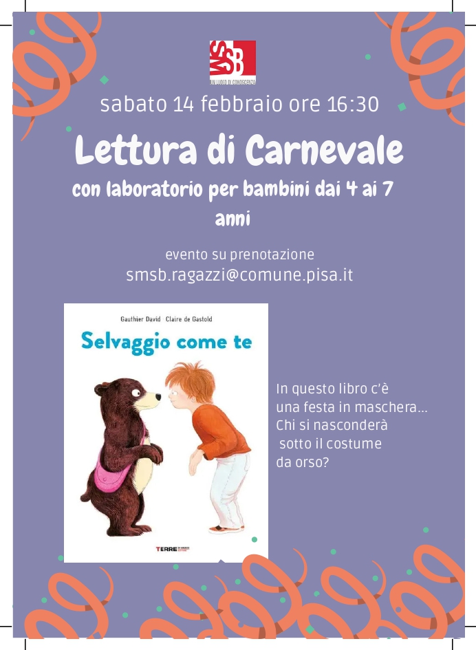 Il 14 febbraio alle 16.30, nella sezione ragazzi della biblioteca SmS si terrà l'iniziativa "Lettura di Carnevale", un pomeriggio speciale dedicato alle storie e alla fantasia. E' prevista la lettura di "Selvaggio come te" di Gauthier David e Claire de Gastold ,un albo intenso e poetico che racconta, con originalità e tenerezza, il legame profondo fra bambini e animali. Un’occasione per ascoltare, immaginare e lasciarsi sorprendere…in perfetto spirito carnevalesco!