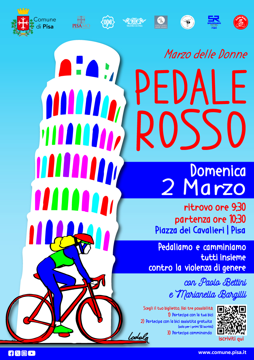 Domenica 2 marzo arriva a Pisa la seconda edizione di “Pedale Rosso” la pedalata e camminata solidale a cura dell’attrice Marianella Bargilli e del campione olimpionico Paolo Bettini per sensibilizzare contro la violenza di genere.