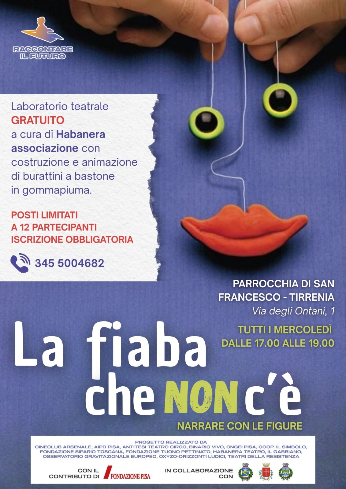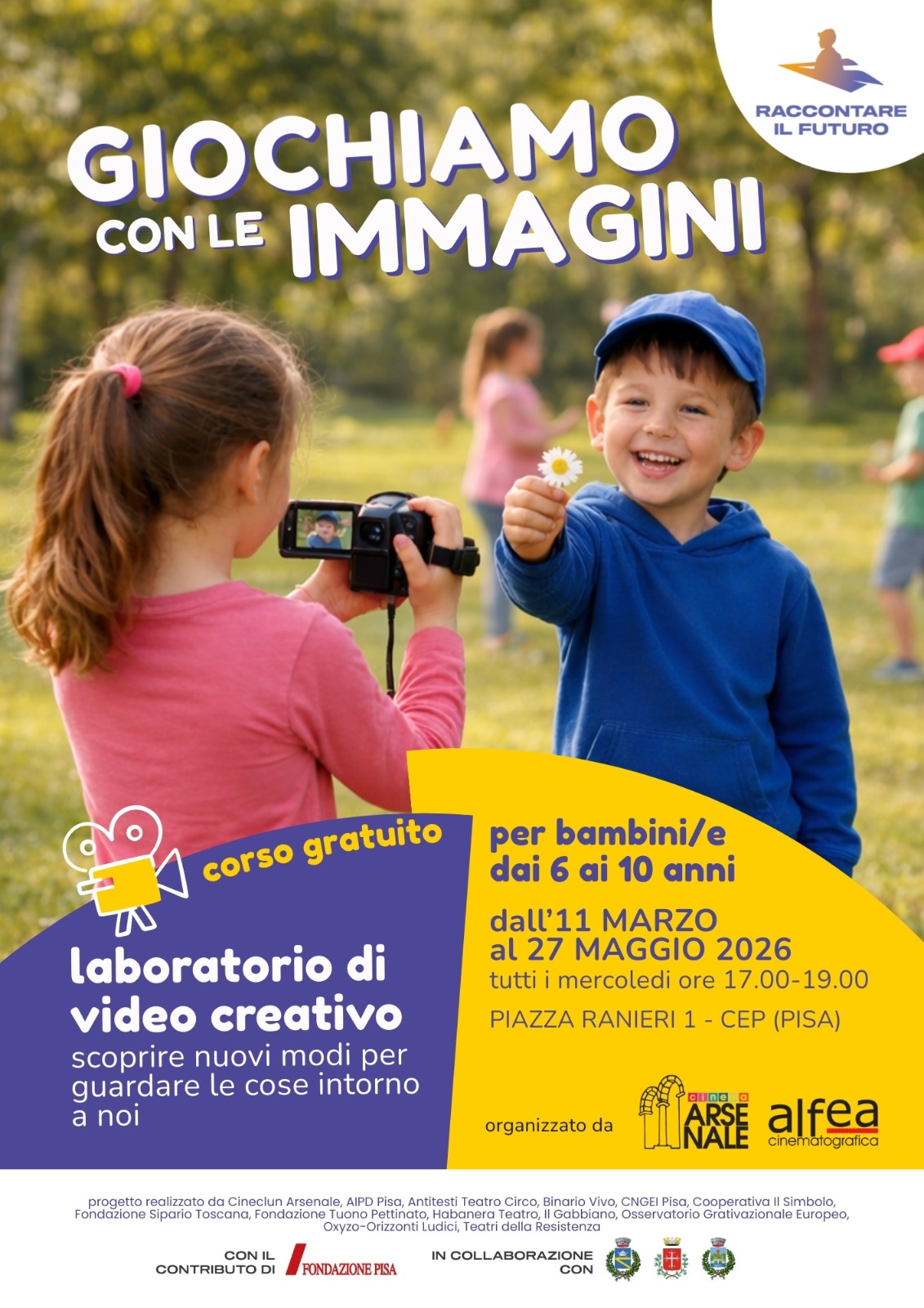 Partner del Progetto: Raccontare il futuro è realizzato in collaborazione con i Comuni di Pisa, Cascina e San Giuliano Terme. Il capofila Cineclub Arsenale di Pisa ha come partner: AIPD Pisa, Antitesi Teatro Circo, Binario Vivo, CNGEI Pisa, Coop. Il Simbolo, Fondazione Sipario Toscana, Fondazione Tuono Pettinato, Habanera Teatro, Il Gabbiano, Osservatorio Gravitazionale Europeo, OxyzO-Orizzonti Ludici, Teatri della resistenza.